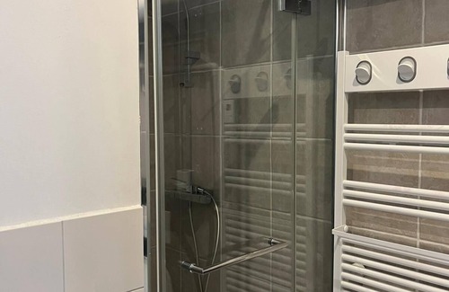 The bathroom is generous in size and recently renovated, with a walk-in shower, sink, and separate toilet. There’s also plenty of storage space in the sleeping area to keep things organized during your stay.