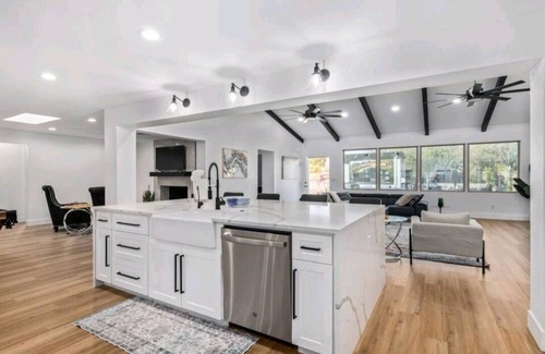 Our home is a spacious 4 bedroom, 3 bath, modern oasis with bursts of color is perfect for groups of up to 12. The oversized kitchen contains all essential amenities. The oversized kitchen island is perfect for setting up a buffet-style breakfast or afternoon appetizers. The dining room table seats eight. The open concept living space inside, combined, makes this the perfect place for any family/friend getaway.