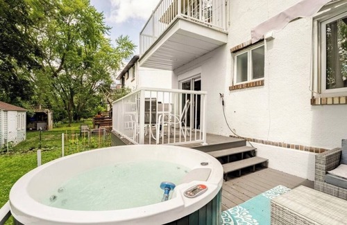 Welcome to this charming newly renovated house in Hampstead.This pleasant property features 2 bedrooms with 2 queen beds and 1 futon in the office space. Sleeps 5. Open concept living room/ dining area with beautiful hardwood floors with inlays. 2 full bathrooms, 2 electric fireplaces, and a large backyard with a double patio deck fully furnished. Includes a 2 person hottub. In a mature area close to public transit, shopping, churches and synagogues. Parking is included.