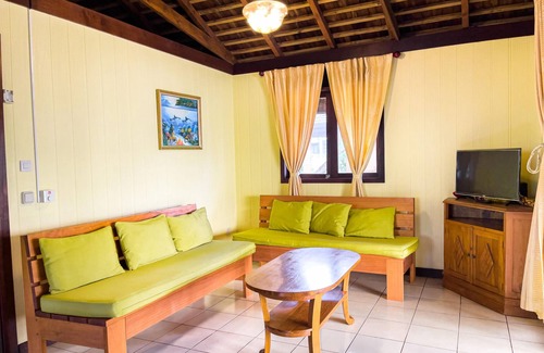 Moorea is a small piece of paradise, located only 17km from the island of Tahiti. Between the emerald and turquoise lagoon, the white sandy beach and the green endemic garden, Moorea island benefits from a natural environment preserved like a postcard. The Nuku-Hiva bungalow, ideal for family stays, is located in a private property composed of 4 independent bungalows. This 45 m² accommodation can accommodate 6 people in the following composition: A master bedroom with a double bed and a closet to organize and store your belongings. A second air-conditioned room with two single beds and a wardrobe.It is possible to add mattresses to accommodate 2 people. The bathroom is equipped with a shower, a sink and a toilet. Towels are at your disposal.The kitchen is equipped with everything you need to prepare your meals. You will have a refrigerator-freezer, a stove, a microwave, a kettle and dishes.The living room has a sofa and a television. The bungalow has wifi internet access.Your favorite place will be the terrace, with deckchairs, table and chairs that await you for your moments of relaxation, an aperitif while admiring the view, your meals ...From the beach, take a moment to admire the coral reef of Moorea. Meet the residents of this crystalline and so pure lagoon of our island by snorkeling, paddle or kayak, and discover our exceptional and rare sea beds.The Essentials :*Ideal for families and groups*Capacity 6 beds*Near surf spot*Near Ferry*Access to the sea*Near Temae golf course*Restaurant on site*Free wifi internet access*Washing machine at disposal*Air conditioned roomsAll reservations are subject to the full acceptance of our general conditions of sale visible on our website Stayinn.Vacations by clicking on the general conditions.Registration number : 825497