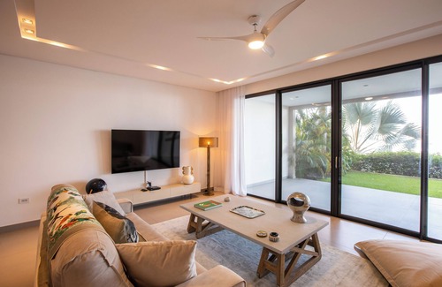 Located on the first floor, this condo is spacious with contemporary décor. Composed of large air-conditioned room with bathroom and dressing rooms, an open kitchen, a large living room with a garden area with lagoon view. All overlooked by a large terrace giving access to an exceptional view of the bay.