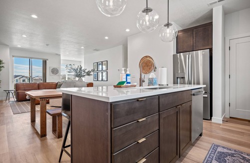 Our townhome is a haven of luxury and comfort, designed to host up to twelve guests with ease. Each bedroom is a sanctuary of relaxation, adorned with high-quality linens, pillows, and towels. The interior showcases elegant plantation shutters, warm wood flooring, and subtle recessed lighting. The living space, illuminated by natural light and mountain views, features a large smart TV and deluxe seating in an inviting open layout. The dining area comfortably seats six, with additional space for four at the kitchen island. Culinary enthusiasts will delight in the fully equipped kitchen, boasting modern appliances, a gas stove, a spacious quartz island, a large fridge, a microwave oven, and all the essentials for crafting gourmet dishes.