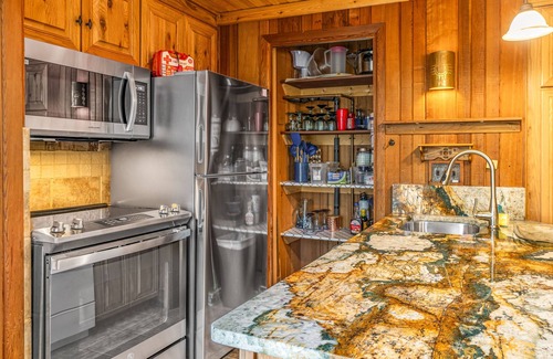 The interior features wood paneling, a stone-faced fireplace, and art of beautiful landscapes that all add to the rustic charm of the condo. On chilly evenings, enjoy streaming your favorite shows and movies from the comfortable sofa while the glow of the fireplace keeps you warm. You'll appreciate starting your day at your private coffee bar and can prepare delicious meals together in the well-equipped kitchen. And at day's end, rest well in the beautifully outfitted bedrooms.