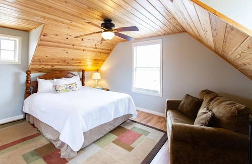 - Loft Bedroom with Queen Bed, flat screen TV, and seating area.