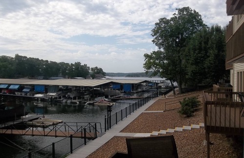 This beautiful 2 bed 2 bath condo at the Lake of the Ozarks has all the comforts of home and has been newly updated, including wood flooring. Upon entering you will be welcomed into a spacious living room, dining room and kitchen looking out to the lake. It is just one easy flight of steps down from the parking lot. The kitchen is well stocked for preparing meals. All appliances are updated and the beautiful counter tops are granite. There is a large dinette set with seating for six. The comfy furniture in the living room includes a matching sleeper sofa, love seat and recliner. There is a flat screen TV, ceiling fan, and most of all large windows and door welcoming you out to the deck and lake. On the deck there is plenty of seating, an electric grill, and most of all steps offering easy access to the docks and pools. If you are bringing a boat or love to fish, you will appreciate how close the condo is to the docks! The condo faces east with sunrise views and relief from the hot afternoon sun. The master bedroom offers a king size bed, private full bathroom, and walk in closet. There is a recliner and tv in the master bedroom suite as well. There are lake view from the three large windows in the master bedroom. The guest bedroom offers a queen size bed and adjacent full bathroom. There is a utility room with a full size washer and dryer. This condo is perfect for two couples! (MAXIMUM IS 4 ADULTS ALL OVER AGE 28, UNLESS ACCOMPANIED BY PARENTS) You will feel spoiled by all the updates the owner has made with you in mind!