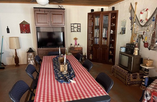 Nestled in a wooded 40-acre lot 25 min to State Capitol and KU and12 min to I 70 has 1 Bedroom , 1 Bathroom, and max occupancy of 4 people. The minimum rental for this property is 1 nights, but this can change depending on the season you plan on staying. Previous guests have given good rated it, and VRBO labeled it a top-rated House because of the excellent services rendered by the owner or manager of this House, and has consistently provided great experiences for their guests. Most families or guests that use it recommend it to their friends and some of them are repeat guests. House has a friendly neighborhood, and the Lecompton has interesting places to visit. If you want to learn more about the House in Lecompton, such as places to visit and things to do nearby, you can check below to learn more.