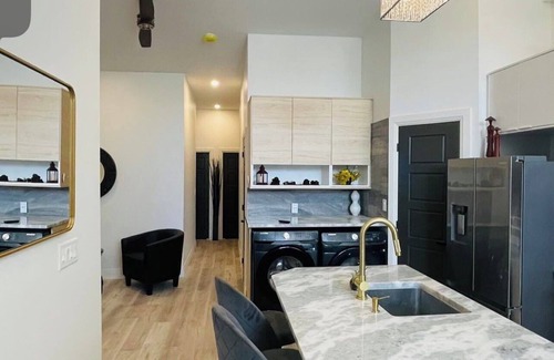 These brand new unique and stylish place to stay is one of a kind. Great for company stays. The space boasts grand high ceilings, beautiful boutique style decor, 3 bedroom with 3 private ensuite baths. The unit includes a full kitchen, washer & dryer and a beautiful balcony for some R&R. These units are purpose built for transient and out of town workers. Privacy and comfort are paramount in this unit . Come be one of the first, to stay in these beautiful spacious units !