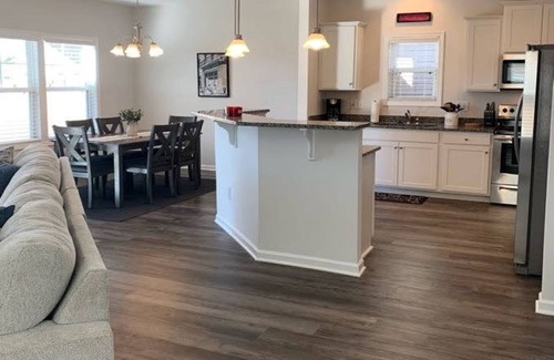Brand New 3 Bedroom Home with Living Area Down Stairs. Large Bedrooms with 65" New Flat Screen TV's and one with 45" LED TV. All have TV's have access to Roku channels, Spectrum local 125 plus Channels, Netflix. You can login into Youtube TV, Prime, HBO, Showtime with your OWN Login. All New Furniture, Bed's Etc. LVP Flooring. Back Patio with two chairs & small table. Master has King Size Bed, Other Two Beds are Queen Size.
