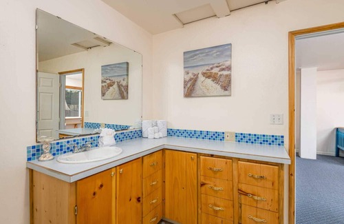 Sit back and watch a movie in the cozy living room with a large flat screen tv and wood burning stove. When it's time for bed this two bedroom two bath home w/ bonus room has a queen bed in the downstairs bedroom, a queen bed in the upstairs bedroom, a queen and twin bed in the bonus room upstairs.