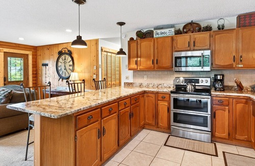 Downstairs, you’ll find a fun and functional space perfect for families or groups. A queen-size bunk bed room and a twin bedroom—each with a TV—share a jack-and-jill bathroom with a shower and combined laundry area. The lower level also includes garage access, where you’ll find a pool table and an extra refrigerator, along with parking space for one car.