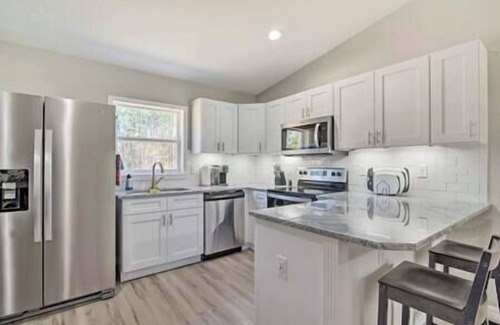 Whether you're looking for a weekend getaway or a several month stay this modern vacation home in Marion Oaks is an excellent choice! Sunny days of fun await you at this new construction 3-bedroom, 2-bath home with a well-equipped kitchen, Smart TV, an en-suite bathroom, laundry equipment and a big fully-fenced backyard for your furry friend. Explore the Ocala National Forest, visit the Florida Horse Park (11mi), or World Equestrian Center (14mi), visit The Villages, or a day trip to Orlando.