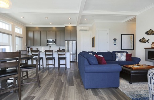 The primary bedroom features a King-sized bed with a modern canopy bed frame, ensuite bath, electric fireplace, Smart TV, plush throw rugs, and a comfortable leather lounge chair perfect for a good book. Fall asleep in comfort to the soothing sounds of the ocean in the second bedroom, which has a Queen-sized bed and Smart TV.