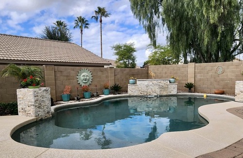 Sunny, Clean and Comfortable! If you are a Sports fan, Foodie and/or a Nature Lover, Arizona is the place to be for Fall/Winter and Spring! This 3 bedroom 2 bath with split floor plan and a pool is centrally located and a perfect place to enjoy the best AZ has to offer. Beautiful weather, exciting entertainment venues and delicious eats. Full amenities, smart TV, kitchen, comfortable furniture, and queen size beds. Quiet neighborhood. Near walking trails, parks, restaurants, theaters and seasonal events.
