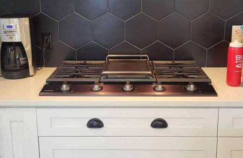 The kitchen is a chef's dream with quartz counter tops, wood shaker cabinets, brand new Bosch appliances, built in oven and microwave with convection and a gas 6 burner Samsung stove top. The kitchen is also equipped with all the necessary kitchen utensils and gadgets to prepare your favourite meals (kitchen aid mixer, immersion blender, air fryer, and more). Please enjoy a beautiful Americano or Espresso with our Breville espresso machine or traditional brewed coffee from the family size coffee pot.