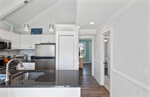 The living area is designed for comfort, features a queen-size sleeper sofa, two plush recliners, a fresh color palette, and a 65” Smart TV. The updated kitchen, complete with granite countertops and quality appliances, is fully stocked for home-cooked meals.