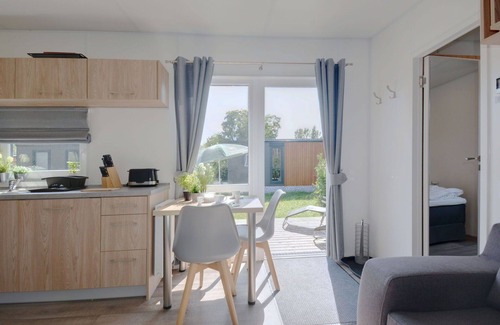The mobile home offers a fully equipped open kitchen with an oven, gas stove, 2 gas rings, kettle, and an electric coffee machine. It also has a shower room with a toilet. For your convenience, gas heating is available to keep you warm. Outside, you'll find a terrace spanning 24 square meters, complete with terrace furniture for outdoor relaxation. A reserved parking spot is located just 50 meters away.