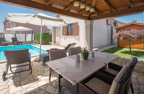 This friendly holiday home with pool will certainly not disappoint you. It is located in a neighbourhood of Katelir and is tastefully furnished. It consists of two bedrooms, a living room, kitchen and a bathroom. In addition to a swimming pool where you can refresh yourself in the hot summer days, you will also find a gazebo with garden furniture, barbecue and sun loungers. You can walk to the nearest restaurant or supermarket and the beach, where you can enjoy a wonderful holiday by the sea, is about 10 minutes away by car. Explore beautiful Istria with charming destinations that are well worth a visit.
