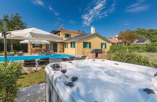 This exceptionally well-designed holiday home is located on the edge of a pretty village in the heart of Istria. It is stylishly furnished and offers you every comfort. The interior design meets today's standards, while the special feature here is certainly the underfloor heating and cooling. Such a cooling system offers significantly better cooling of the rooms and thus prevents noise and draughts from the air conditioning systems. Access from the indoor and outdoor areas is via the spacious terrace, where parents can enjoy a wide view of everything going on around the pool. The pool area also includes an outdoor hot tub where guests can spend even more relaxing hours during the summer months. To complete the stay, the homeowners also provide guests with a plot of land below the holiday complex for shared use with the guests of holiday property CIL070. There is a children's playground and a sports and leisure centre. There is also a football pitch just 150 metres from the holiday home. This is certainly an advantage for a relatively large family or group of friends who would like to spend their holiday together. The house is in a quiet location on the edge of its own forest and is the last house on the outskirts of the village. The location is ideal for running, hiking or walking the dog. Attractions, art and culture in the surrounding area that are ideal for day trips are the Roman Colosseum in Pula, the truffle town of Motovun, the beautiful town of Rovinj or, certainly interesting for children, the Aqua Park in Pore.