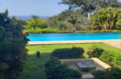 This House offers jungle and ocean views and unforgettable sunsets . You hear crashing waves and will be able to swim in a 60' infinity -edge lap pool, always with perfect swimming temperatures and for lounging upon. The House sits 300'up and 1/2 km back up from the ocean near perfect year-round temperatures. all concrete construction with wood and AC in both bedrooms . the House stays cool all day long. Lush tree canopies attract monkeys and bird close. The sound of nature will prevail.