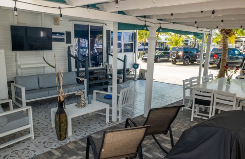 Come relax in the Florida Keys! This property has a fully equipped kitchen and coffee station. Fully furnished patio, with outdoor dining table, BBQ, and TV. This mobile home trailer sleeps up to 5 people. 2 queen beds & 1 sofa bed. Extra pillows and blankets provided. Bathroom has all your essential needs, shampoo, conditioner, body soap and towels.