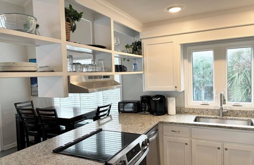 Beach Front with views of Folly Fishing Pier. This recently renovated charming cottage has 2 queen beds and 1 King bed along with a queen sleeper sofa bed. The open kitchen features granite countertops and an ocean view while you cook. The open floor plan allows for easy conversation and entertaining. Hardwood floors, spiral staircase, washer & dryer, ceiling fans in all rooms. This home features a fenced yard and fenced deck for a pet safe environment.