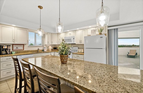 The kitchen is a chef's paradise, and the living area is cozy and inviting with sliders leading to the oceanfront patio and a generously sized side patio.