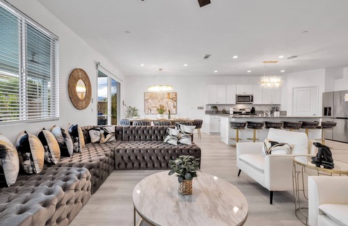 Oh La La Coachella is the ultimate retreat for a fun-filled weekend with friends and family. This spacious home sleeps up to 23 guests across 8 bedrooms. Outside, you’ll find a brand-new pool and spa, pickleball court, BBQ, fire pit, outdoor dining, and plenty of games- perfect for relaxing or entertaining.