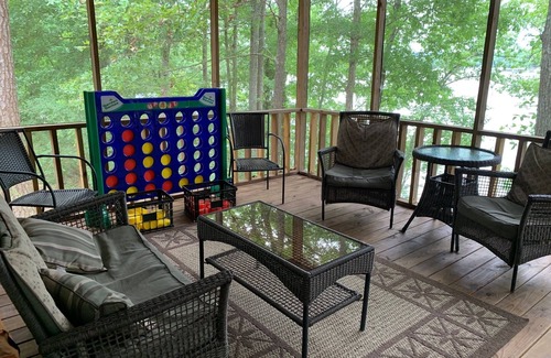 As nice as the upper levels are, the lower level is where all the fun is. Challenge your friends to a game of pool, air hockey or a classic arcade game. Then, settle into the sofas and watch the big game on the 65" tv, or just hang out on the lower patio and stare at the lake. In addition to the rec areas, the lower level also offers a third bedroom with a queen bed, decorated in a nautical theme and a fourth bedroom with two sets of bunk beds, decorated in a camping theme with a dedicated video gaming tv. A full bath will make sure you're not running up and down stairs all day.
