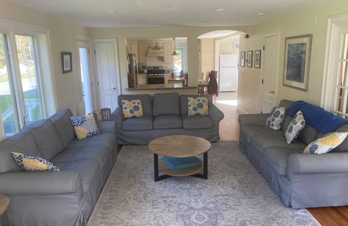 The first floor entry, sunroom, kitchen and dining rooms have custom tile floors, while the living room is oak. All stairs, catwalks and bedrooms have beautiful blond maple floors with area rugs spread throughout. The large palladium window and cathedral ceiling above the foyer allows plenty of light to shine on a two-story, central staircase, while framing views of the front lawn from the catwalk. There are five TVs, high speed Wi-Fi and all new appliances. There is plenty of parking along the circular driveway and enough room for a boat or an RV. The lawn area is approximately one acre with plenty of flat, wide open space. The back porch can be accessed from a handicap accessible ramp. It is quiet and peaceful in the absence of any traffic noise or light pollution. This is a great place for stargazing. Portland is less than 30 minutes away and Kennebunkport is just a 15 minute drive.