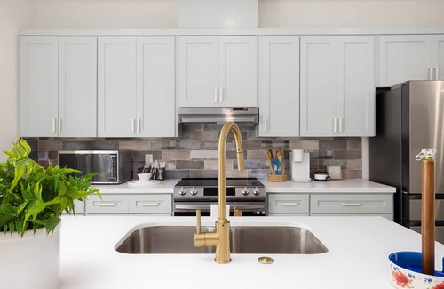 - Modern kitchen with quartz countertops and stainless steel appliances