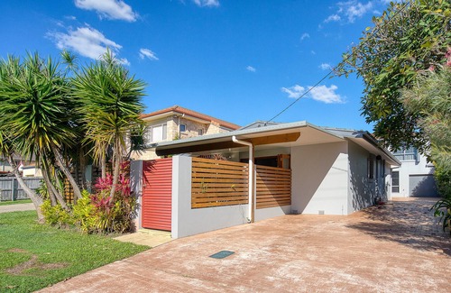 Airy Palm Beach Cottage featuring bi-fold doors out to the deck and undercover entertaining area.