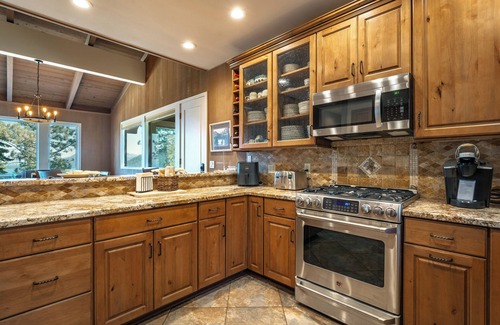 This gorgeous single story house with panoramic views of Lake Tahoe has been totally remodeled and features every amenity, including a level 2 EV charger in the garage Access to the stunning private Lake Tahoe Park Beach club is included. Our house features a lovely gourmet kitchen and master bath with jetted tub, two fireplaces, huge L- shaped deck overlooking the Lake with a Sundance Spa, new luxury mattresses, gas BBQ and a brand new fire pit on the patio, surrounded by towering pines. The kitchen is equipped with high quality cookware and a myriad of appliances and utensils for meals from casual to gourmet.