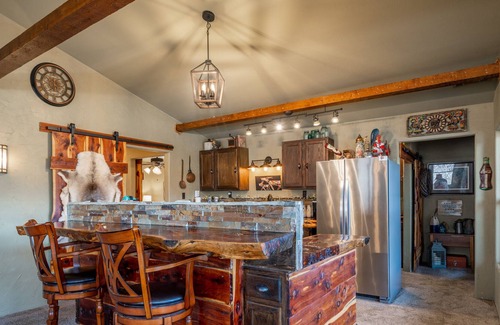 The cabin features two bedrooms, each with a comfortable queen-size bed and tasteful decor. The kitchen is fully equipped with everything you need to cook up a delicious meal, and there's a counter with 4 stools for indoor dining.