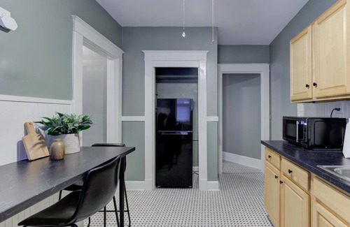 Traditional apartment with beautiful craftsman wood work and high ceilings, this 1915 Midtown building has tons of historic charm but with contemporary amenities and updates. The shared balcony is perfect for morning coffee. The unit itself is peaceful and comfortable, with a full kitchen, full bathroom and combined living room/bedroom area. Enter into a spacious foyer and go straight on to the newly renovated kitchen with breakfast bar. The light-soaked bathroom has also just been renovated with new marble tile surround, pedestal sink, and new flooring. The living room/bedroom is warm and tranquil and features a super comfy memory foam mattress, a desk should you need a quiet space to work, and a sofa to unwind on. Pets are welcome.