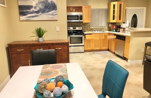 Welcome to our beautiful 2 bedroom, 1 bathroom home in a very quiet neighborhood. King bed in the master bedroom and queen bed in the second bedroom with smart tvs, lots of closet space. Spacious living room with 50" Smart TV that has netflix, youtube, and other streaming services. The kitchen is fully equipped with pots, plates and utensils, coffee maker and toaster. There's a carport for free parking, Large patio, Laundry room, Fast wifi, Towels, toiletries, etc… 45 minutes from beaches.