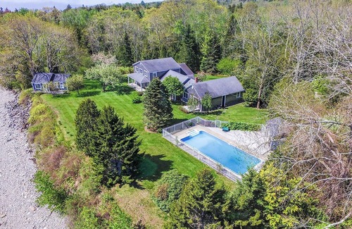This property has comfortable, yet classic furniture plus a business class internet, new pool decking and new windows. With close access to Lincolnville Beach, a fenced in swimming pool, and plenty of room for puzzles, movies, or curling up next to the fireplace, Penobscot View continues to offer a great vacation to any guest lucky enough to stay here. The beautifully lanscaped grounds enjoy privacy with panoramic views of Islesboro and the bay. The large yard is great for games and playor just watching the boats go by. Relax on the porch or patio while enjoying the sea breezes. Inside, there is comfortable seating for visiting or lounging, a great kitchen for cooking, a large living area with gas fireplace and gaming table, 3 first floor bedrooms, and a large 2nd floor master suite. The kitchen, dining area, living area and master suite all enjoy broad ocean views.
