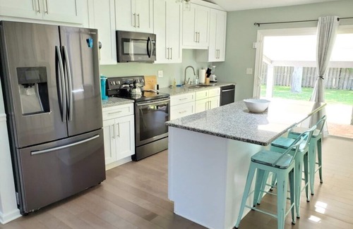 The pool is located in a large fenced in back yard with plenty of privacy. It offers a large poolside patio with chairs and chaise lounges and an outside dining area with propane BBQ. The grill is ready to go for steaks or burgers and has a side burner for your low country shrimp boil. The backyard has plenty of palms and tropical plants for a real island feeling. There is also plenty of space for playing cornhole (boards and bags included) in the yard. Your pet will have room to roam in the large yard as well. So whether you want to enjoy the cool breeze or cold A/C, you can enjoy the view of the pool and yard from almost everywhere inside the home.