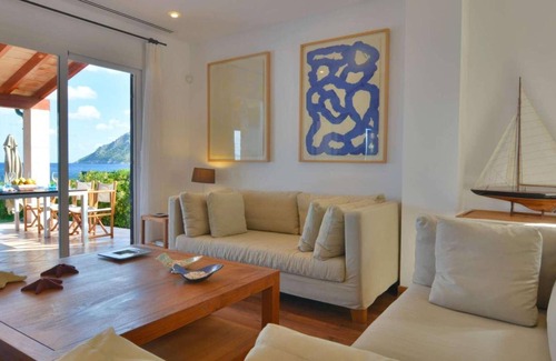 The pleasantly named "Es Calo" is a white beach villa with cobblestone inlay, nestled in a village that can be best described as the sea's front garden. The property's great location is only a stone's throw away from a small sandy beach and crystal clear waters. You can see the sea stretch out in front of your very eyes into the horizon whilst simultaneously enjoying a view of the most sublime mountains in the east coast, including Son Morell and Puig de Ferrutx. The backdrop is so so unbelievably beautiful that it can hardly be put into words. A series of spacious terraces and numerous places to sit, as well as an evergreen lawn and a very large pool form a little oasis in these splendid surroundings, separated from the neighbours by green hedgerows. The pool, with surrounding sun terrace, has comfy sun-loungers and parasols to offer. A terrace covered by a bamboo canopy on the side of the house is a very chilled-out spot with a touch of caribbean relaxation. In this atmosphere, you can have a quick, relaxed game of table-tennis if you need a change. If you're getting together in the early evening, then why not enjoy the sunset in the calming setting of the lounge with its sea and mountain views, before kicking off the barbecue evening in the neighbouring dining area? Breakfast at daybreak, a drink at sundown – every part of the day has its very own appeal in this fabulous place. Each and every meal can be transferred outside, as the no less impressive interior of this incredible villa is accessible through numerous floor length windows.