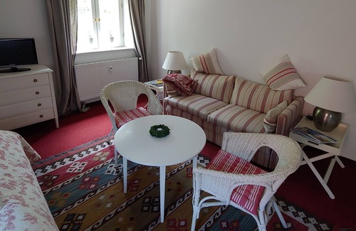 The apartment on the historic estate for 2 people with a special atmosphere and a wonderful view of the large plane tree in the park has a large living room / bedroom with a fitted kitchen and a shower room. The calm in the cozy dairy farm has done so many stressed guests so well that they would be happy to come back soon. A television is available and invites you to cozy moments.