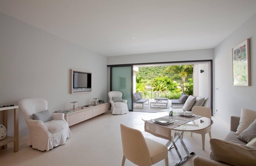 The living room opens onto the terrace and the view. The decoration is modern and uncluttered. The living area is air-conditioned.