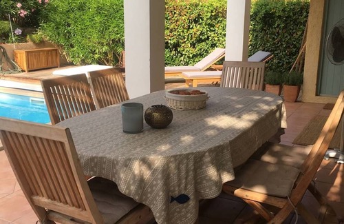 Côté Issambres in Ste Maxime, charming house on two levels with swimming pool of 8 x 4. It is particularly well equipped. Residents will appreciate going to the beach of 44 on foot, shopping possible also without a car and living in a refined setting in a beautiful neighborhood. This "cosy" and very comfortable villa. Reversible air conditioning throughout the house. Small intimate and charming garden.