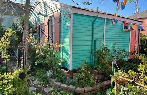 Located in the lush garden behind our 1852 Creole Cottage where we've lived 14 years in the funky Bywater neighborhood. Accessed via metal gate along an uneven brick and river rock sidewalk, your home is a private small cottage with separate bedroom, bathroom with clawfoot tub, and charming kitchen that has a butcher block countertop complete with a Washer/Dryer. NO SHARED WALLS or floors - enjoy your privacy. Two window units and cool and heat the small space. The garden features nearly 100 different herbs, native plants, citrus, peppers, roses and more used in our Apothecary business. Try the chocolate mint!