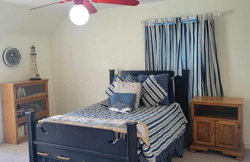 The King size bed in the Master bedroom has a heavenly mattress and views from the front windows. Beautifully remodeled master bath includes a handicapped accessible shower stall. Soak away the stress of your daily shopping trips in the beautiful, antique claw foot tub.