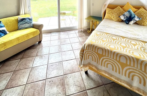 Adjacent to the main residence, the guest studio encapsulates charm and privacy, featuring a kitchenette, bathroom, and shower. This space is ideal for hosting guests, offering them comfort and independence, or serving as a peaceful retreat for artistic or contemplative pursuits.