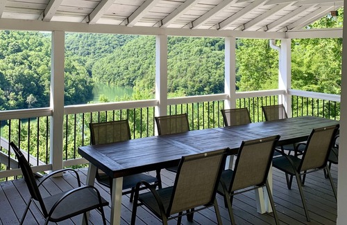 Silent Canoe features 5 bedrooms & 4.5 baths, including 3 king suites, a bunk room, and a private loft. There are lake views from nearly every room, a wrap-around covered porch, a covered dining porch, a game room, and a fire pit!