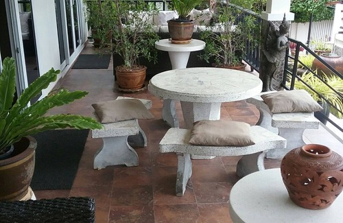 The villa is set in a large plot with superb gardens and many tropical bushes and flowers. There is a large 10x3 metre covered front terrace which is raised above the garden to provide excellent views of the large fish pond. The pond runs the width of the home and contains many water plants within and tropical plants surrounding it. On the terrace there is a Thai style marble type dining table with matching bench seating, 2 x sofas, 2 x chairs & drinks tables. To the side is a large car port and a garden planted with beautiful and various coloured Bougainvillea.