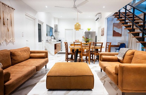 Mae Casa is a modern oasis and gives you the feel of solitude while being only a 10-15 minute walk (5 minute drive) to the beaches, downtown shopping, bakeries, restaurants and stores.