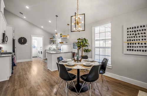 Welcome to Pythagoras Place located in the up and coming East End of Houston. Pythagoras was an ancient Greek philosopher and an icon of geometric theory. This space is inspired by geometric mid century modern design. The clean geometric shapes and vibrant colors will awaken your senses and replenish your vibe. We invite you to be inspired, be creative, be wondrous and be yourself in this beautifully appointed home. This space is perfect for families, groups of friends, co-working inhabitants or anyone seeking privacy and comfort.