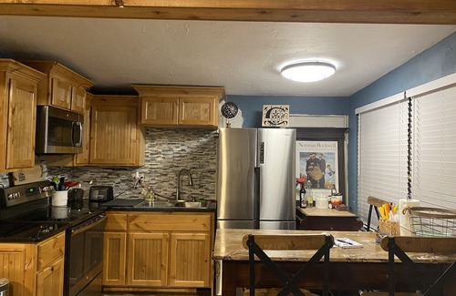 Our Quaint Cabin in the Park is just a short walk from the beautiful creek and downtown shops in Medicine Park. It has a huge deck that is great for outdoor dining, catching up with friends, and enjoying the breathtaking view. From the deck you can often times see deer on the mountain. The cabin has been completely remodeled on the inside with new appliances in the kitchen. Kayaks are available onsite for the the visitors to use during their stay.