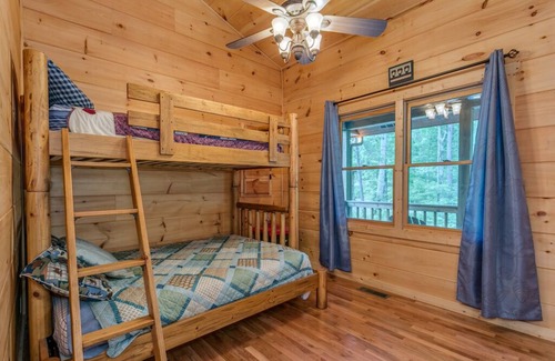 A seasonal wood burning fireplace in the great room keeps movie nights nice and toasty! The cabin offers guests a master suite with a queen bed and covered porch access as well as a second bedroom with bunkbeds and a flatscreen TV and a third with a full bed and twin. The updated kitchen has everything guests need to cook a tasty meal during their stay and the four-seat dining table gives guests a great view while eating.